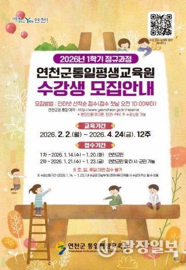 광장일보 주재영 기자 | 연천군은 군민의 평생학습 참여 기회를 확대하기 위해 2026년 1학기 평생교육 정규과정 수강생을 모집한다고 밝혔다.
