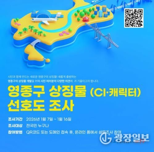 광장일보 주재영 기자 | 인천시 중구는 올해 7월 출범할 ‘영종구’의 정체성과 지역 이미지를 담은 영종구 상징물(CI, 캐릭터) 선정을 위해 선호도조사를 실시한다고 6일 밝혔다.