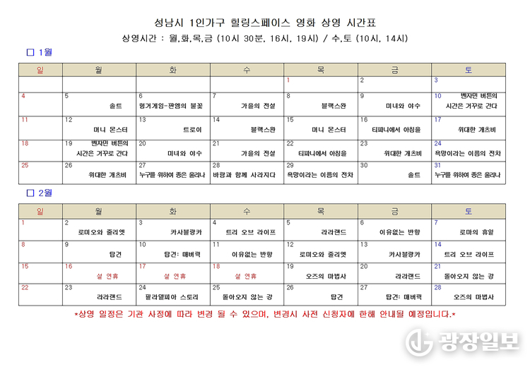 성남시= 주재영 기자 | 성남시는 오는 2월 28일까지 중원구 둔촌대로 100에 위치한 1인 가구 힐링스페이스 커뮤니티 홀에서 ‘추억의 할리우드 영화’를 총 120회 무료 상영한다고 밝혔다.