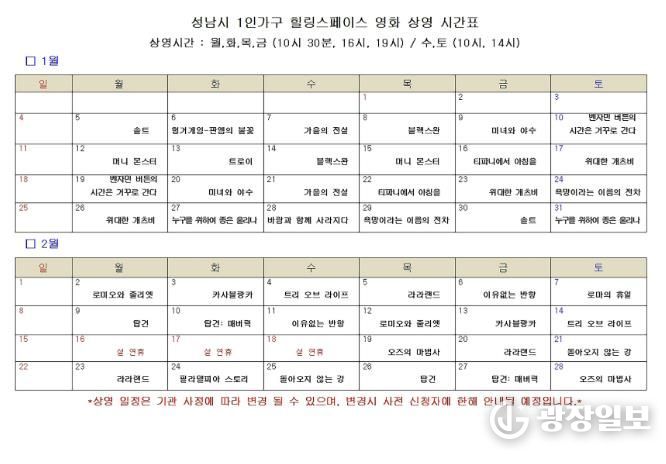 광장일보 주재영 기자 | 성남시는 오는 2월 28일까지 1인 가구 힐링 스페이스 커뮤니티 홀(중원구 둔촌대로 100 4층)에서 ‘추억의 할리우드 영화’를 총 120회 무료 상영한다.