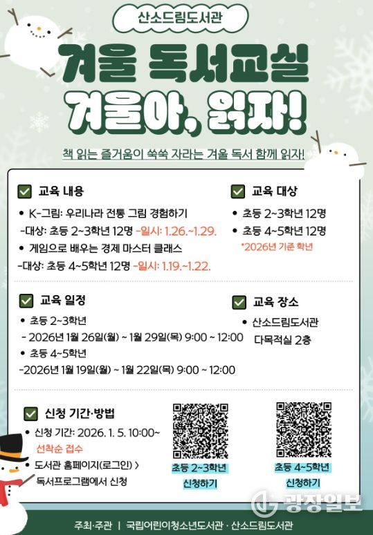 이번 겨울 독서교실은 1월 19일부터 29일까지(주말 제외) 매일 오전 9시부터 12시까지 진행되며, 겨울방학 기간 동안 책과 연계한 다양한 독서 활동을 통해 어린이들의 독서 흥미를 높이고 지속적인 독서 습관 형성을 도모하고자 마련됐다.