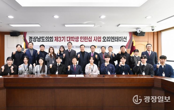 광장일보 주재영 기자 | 경상남도의회가 7일, 제3기 대학생 인턴십 사업의 일환으로 의회·대학·인턴(학생) 간 3자협약을 체결하고 오리엔테이션을 개최하며 사업 운영에 본격 착수했다. 경남도의회 대학생 인턴십 사업은 도내 지역대학과의 교류·협력을 통해 의원들의 정책활동을 지원하는 한편, 대학생들에게는 지방의회 현장 체험과 진로 탐색의 기회를 제공하기 위해 추진되는 사업이다.
