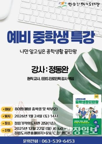 정읍기적의도서관은 오는 24일 토요일 오후 2시, 올해 중학교로 진학하는 학생 대상으로 특별 강연을 운영한다고 8일 밝혔다.