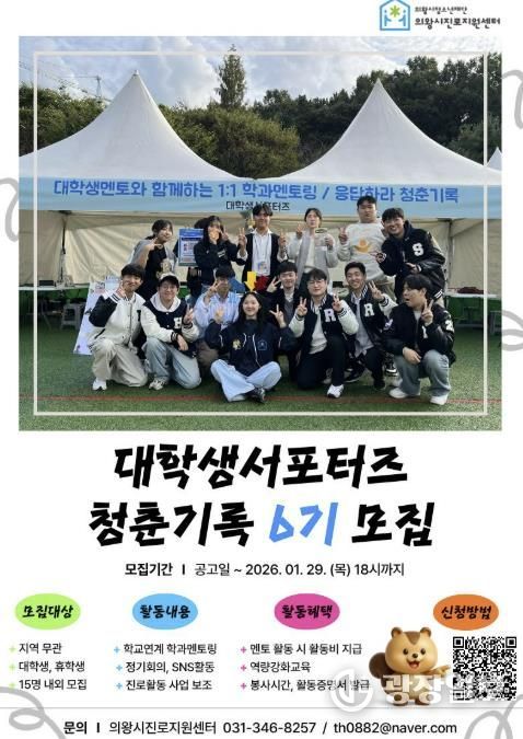 광장일보 주재영 기자 | 의왕시청소년재단 산하 의왕시진로지원센터 ‘꿈터’가 청소년 진로 활동에 관심 있는 대학생을 대상으로 2026년 대학생서포터즈 '청춘기록' 6기를 오는 1월 29일까지 모집한다.
