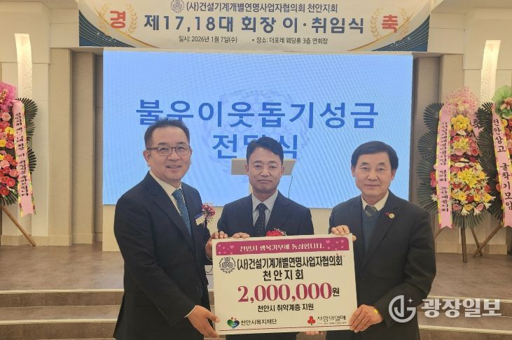 광장일보 주재영 기자 | (재)천안시복지재단은 ㈔건설기계개별연명사업자협의회 천안지회가 취약계층을 위한 후원금 200만 원을 기탁했다고 8일 밝혔다.