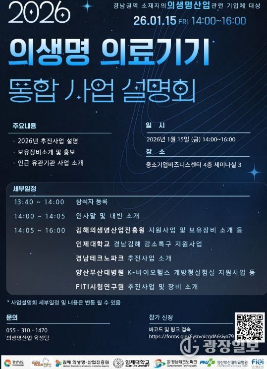 광장일보 주재영 기자 | 김해의생명·산업진흥원은 오는 15일, 지역 내 의료기기 및 헬스케어 기업의 실질적인 경쟁력 확보를 돕기 위한 '2026년 의생명·의료기기 통합 사업설명회'를 개최한다.