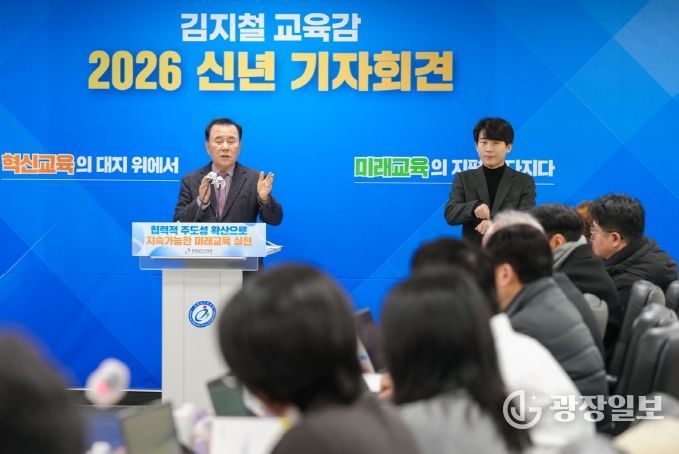 광장일보 주재영 기자 | 김지철 충남교육감은 8일, 도교육청 회의실에서 ‘2026 신년 기자회견’을 열고, ‘2025년 주요 성과와 2026년 12대 중점 추진 과제’를 발표했다.