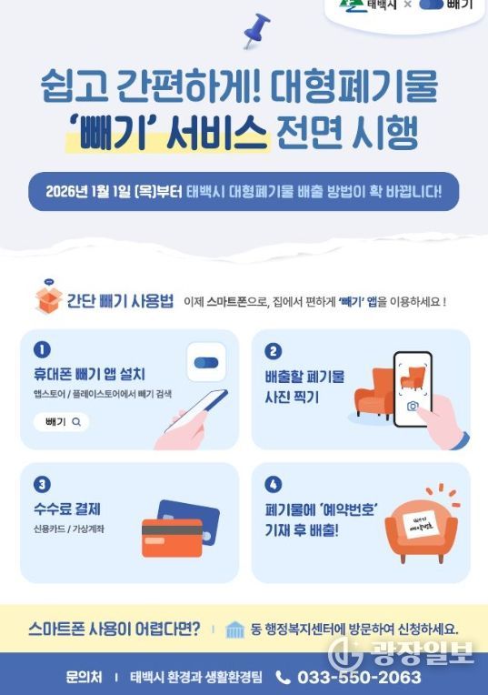 광장일보 이현나 기자 | 태백시는 2026년 1월 1일부터 대형폐기물 배출 신청부터 수수료 결제, 처리 결과 확인까지 전 과정을 스마트폰 앱 ‘빼기’를 통해 원스톱으로 처리할 수 있는 서비스를 본격 시행한다고 밝혔다.