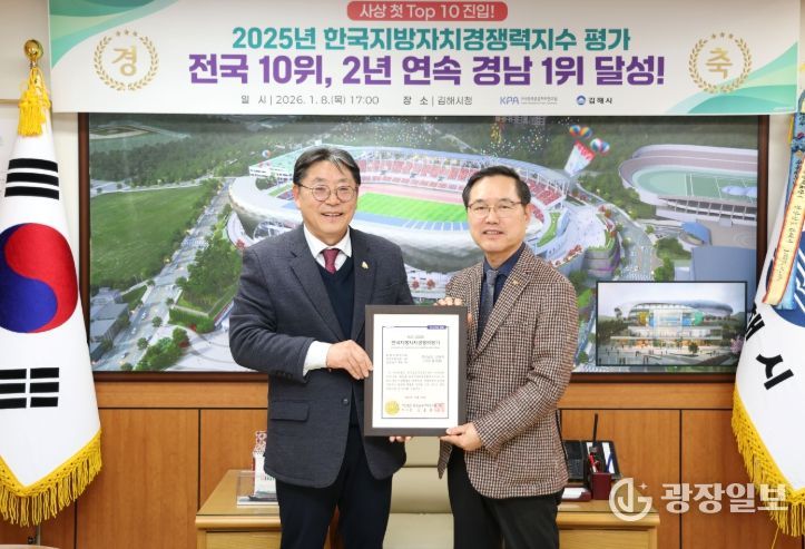 광장일보 주재영 기자 | 지난해 전국에서 열 번째, 경남에서 가장 경쟁력이 높은 도시로 조사된 김해시가 8일 평가 주관기관인 (사)한국공공자치연구원으로부터 공식 인증서를 전달받았다.