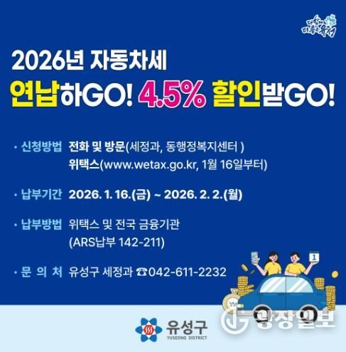 광장일보 이현나 기자 | 대전 유성구는 1월 16일부터 2월 2일까지 자동차세를 미리 내면 세액을 공제받을 수 있는 ‘자동차세 연납 제도’를 운영한다.