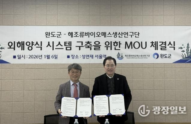 이에 완도군은 지난 6일 서울스퀘어에서 사업 용역을 맡은 해조류 바이오매스 생산연구단(단장 윤환수 성균관대학교 교수)과 해조류 외해 양식 테스트 베드(Test Bed) 구축 및 운영, 기술 협력·교류에 관한 업무 협약을 체결했다.