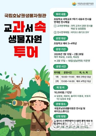 광장일보 주재영 기자 | 기후에너지환경부 산하 국립호남권생물자원관은 겨울방학을 맞이하여 예비 초등학교 3학년부터 4학년을 대상으로 교과서에 나오는 생물을 전시관에서 직접 만나보는 프로그램인 ‘교과서 속 생물자원 투어’를 1월 13일부터 2월 26일까지 운영한다고 밝혔다.