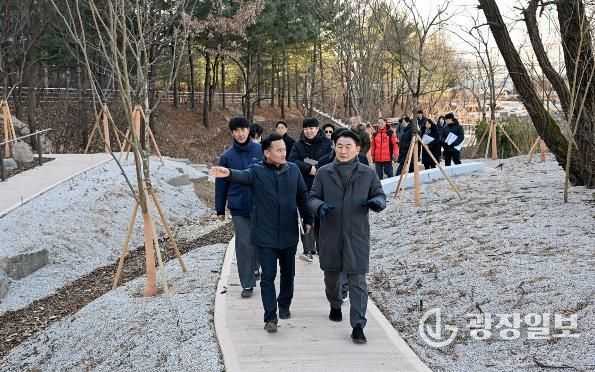 광장일보 주재영 기자 | 의정부시는 2026년 병오년 새해를 맞아 1월 8일 녹지 인프라 확충을 위한 주요 사업 대상지를 현장 점검했다. 점검 대상지는 ▲장암동 실외정원 ▲용현산업단지 완충녹지 산책로 및 가로숲길 조성 사업지 ▲민락동 감성쉼터 등이다. 이번 점검은 도심 속 쉼터와 실외정원 확충, 안전한 보행환경 조성, 산림 명소 발굴 등 녹지 인프라 조성 사업의 추진 현황을 점검하고, 시민들이 일상에서 녹지 공간을 보다 쉽게 이용할 수 있도록 추진 중인 ‘도시숲 프로젝트’의 사업 방향과 현장 여건을 확인하기 위해 진행됐다.