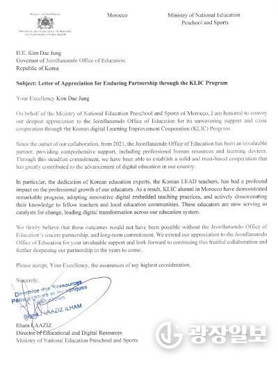 이번 감사 서한은 전라남도교육청이 2021년부터 교육 정보화 지원 사업 (KLIC‧Korean Digital-Learning Improvement Cooperation)을 통해 모로코 교육부와 디지털 교육 분야에서 지속적인 협력을 이어온 데 대한 평가를 담고 있다.