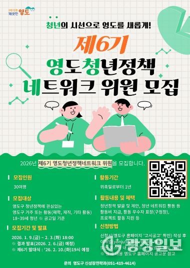광장일보 주재영 기자 | 부산 영도구는 지역 청년들의 목소리를 구정에 반영하고, 청년 스스로 정책 형성 과정에 참여할 수 있도록 ‘제6기 영도청년정책네트워크’ 위원을 1월 9일부터 2월 3일까지 공개 모집한다.