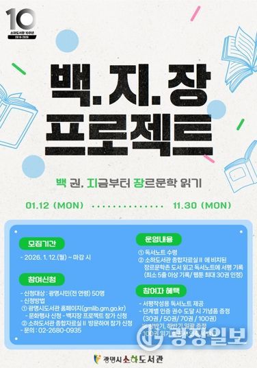 광장일보 주재영 기자 | 광명시 소하도서관은 오는 12일부터 장르문학 도서 100권 읽기 챌린지인 ‘백.지.장 프로젝트’ 참여자를 모집한다.