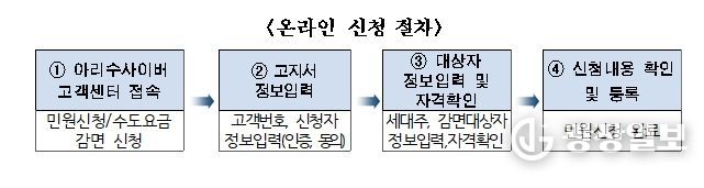 신청방법은 방문신청 또는 온라인신청이 가능하다. 방문 신청은 1월 12일부터 감면받을 주소지 관할 동주민센터에서 우선 접수하며, 온라인 신청은 3월 3일부터 서울아리수본부 누리집 내 아리수 사이버고객센터에서 할 수 있다.