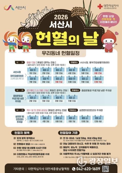 광장일보 주재영 기자 | 충남 서산시가 헌혈 기부 문화 정착과 안정적인 혈액 수급을 위해 ‘2026년 헌혈의 날’을 운영한다고 밝혔다.