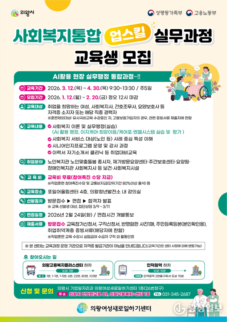 의왕시= 주재영 기자 | 의왕시 여성새로일하기센터는 사회복지 분야 취업을 희망하는 여성을 대상으로 ‘사회복지 통합 업스킬 실무과정’ 교육생을 오는 2월 20일까지 모집한다고 밝혔다.