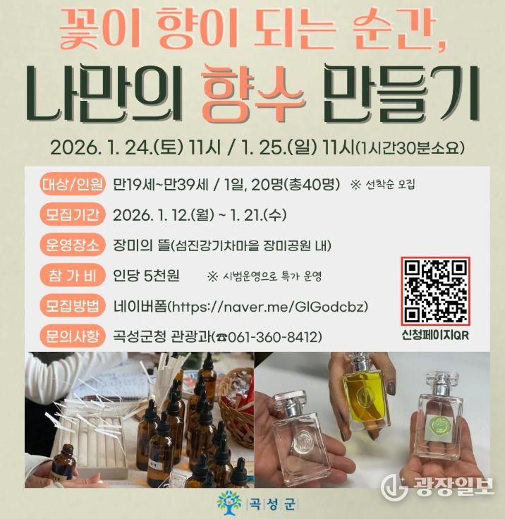 광장일보 주재영 기자 | 곡성군이 섬진강기차마을 장미공원 내 ‘장미의 뜰’(舊 공무도하)에서 오는 1월 24일부터 2월 1일까지 주말 4회에 걸쳐 ‘취향 맞춤형 향수 및 디퓨저 제작 체험’ 프로그램을 운영한다.