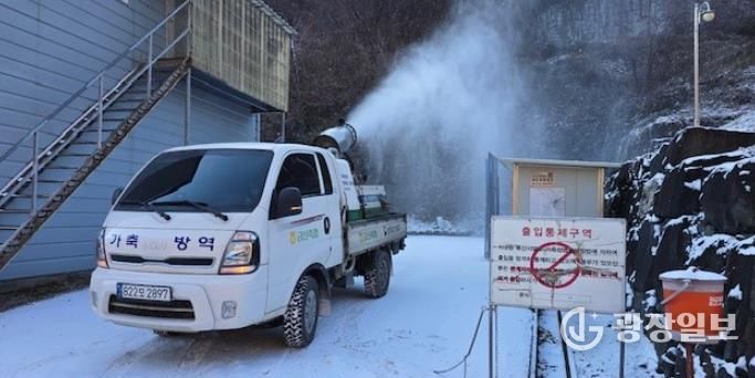 소독은 농장 출입구와 축사 주변, 차량 바퀴 등을 중심으로 진행되며 소 사육농가의 경우 축사 내부 소독도 병행된다.