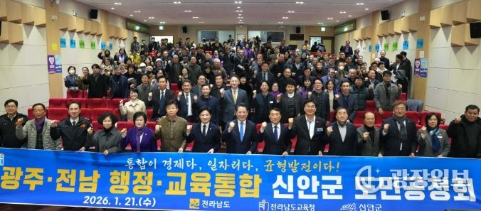 광장일보 주재영 기자 | 전라남도는 21일 광주·전남 행정통합을 주제로 신안군과 목포시에서 도민공청회를 잇따라 열고 서남권 지역별 특성과 현안과제를 중심으로 도민들과 소통하는 시간을 가졌다.