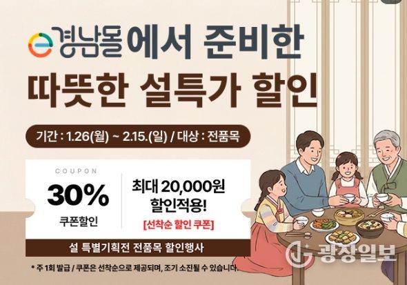 광장일보 주재영 기자 | 경상남도와 (재)경상남도투자경제진흥원이 운영하는 e경남몰은 1월 26일부터 예산 소진 시까지 ‘2026년 풍성한 설맞이 할인 기획전’을 진행한다.