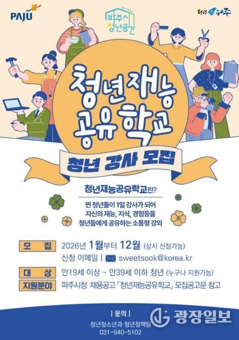 광장일보 주재영 기자 | 파주시는 2026년 1월부터 12월까지 청년을 대상으로 '청년재능공유학교' 청년강사를 연중 상시 모집한다.