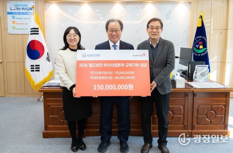 광장일보 주재영 기자 | 부산광역시교육청은 27일 오후 교육청에서 월드비전 부산사업본부(본부장 이현)로부터 1억 5천만원 상당의 교육기부금을 전달받았다.