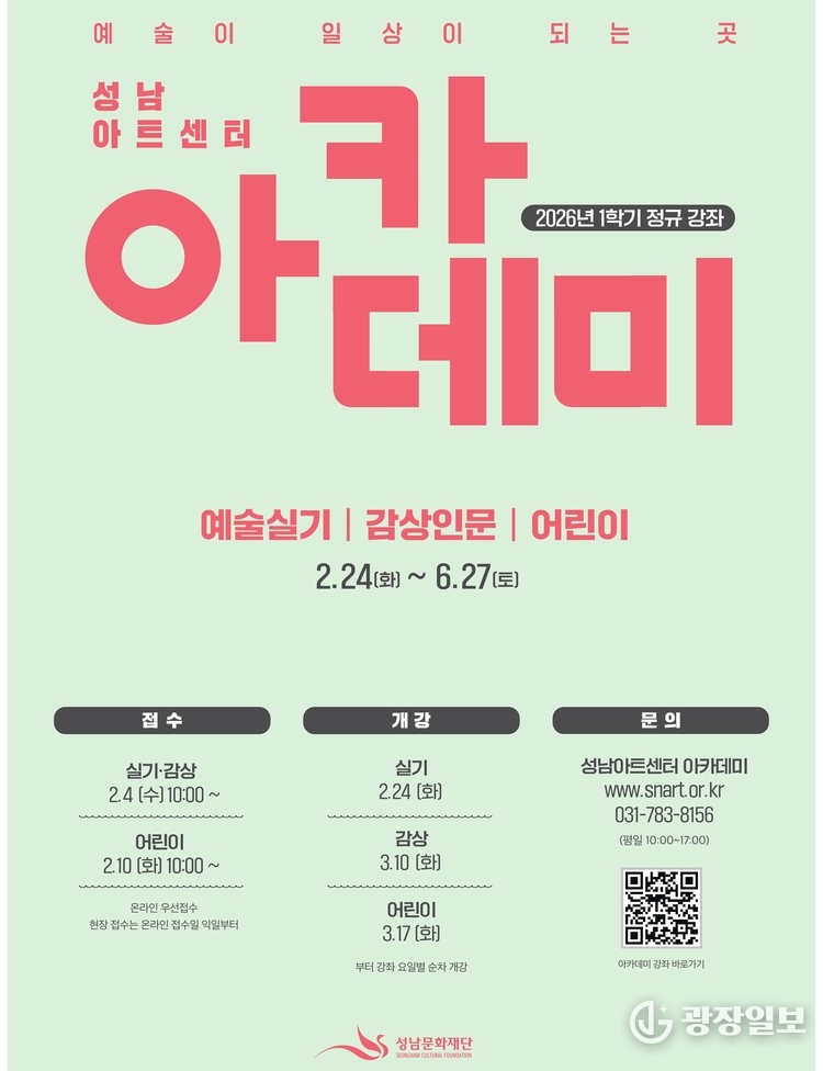 광장일보= 주재영 기자 | 성남아트센터(대표이사 윤정국) 아카데미가 시민들이 일상에서 예술 창작의 즐거움을 누릴 수 있는 2026년 1학기 정규 강좌를 선보인다.