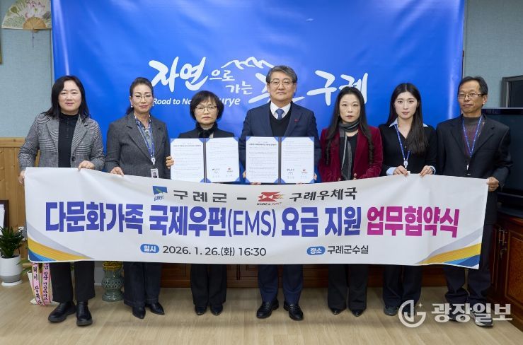 광장일보 주재영 기자 | 전남 구례군은 지난 26일 구례우체국(국장 박인자)과 ‘다문화가족 국제우편(EMS) 요금 지원’을 위한 업무 협약을 체결했다고 밝혔다.