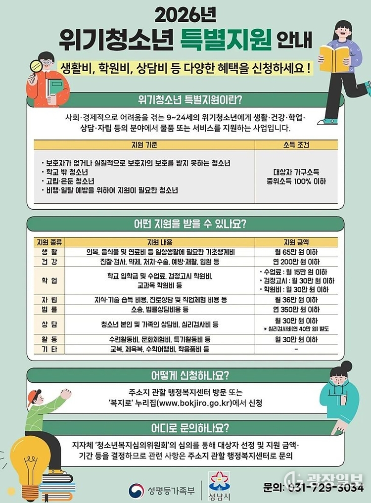 성남시=주재영 기자 | 성남시(시장 신상진)는 사회·경제적 어려움을 겪는 위기 청소년의 생활 안정과 건강한 성장을 돕기 위해 ‘위기 청소년 특별지원 사업’을 시행한다고 3일 밝혔다.
