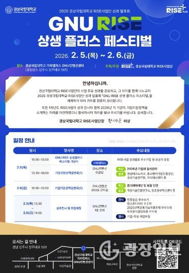 광장일보 주재영 기자 | 경상국립대학교 라이즈(RISE) 사업단(단장 황세운)은 2월 5~6일 가좌캠퍼스 GNU 컨벤션센터 대강당 일원에서 RISE사업의 1차 연도 성과발표회 및 기업지원정책 설명회 ‘GNU RISE 상생 플러스 페스티벌’을 개최한다.