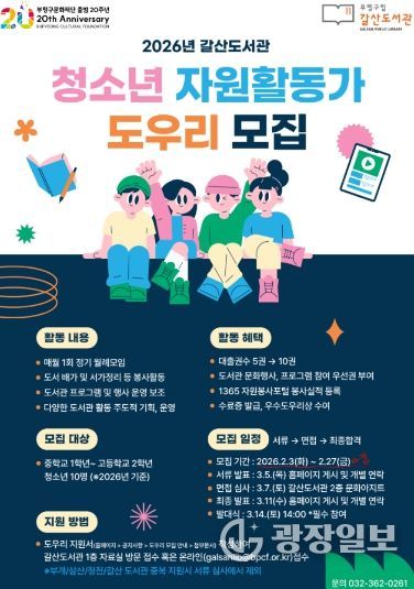 광장일보 주재영 기자 | 부평구립 갈산도서관은 오는 27일까지 청소년 자원활동가 ‘도우리’를 모집한다고 밝혔다.