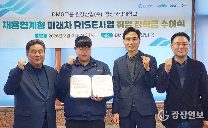 광장일보 주재영 기자 | 경상국립대학교는 2월 4일 오전 11시 함안군에 소재한 원강산업(주) 회의실에서 ‘채용연계형 미래차 RISE사업 취업 장학금 수여식’을 개최했다.