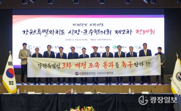 광장일보 주재영 기자 | 강원특별자치도시장군수협의회는 2026년 2월 4일 오전 11시, 영월군 ‘더 한옥헤리티지 영빈관’에서 민선8기 4차년도 제2차 정례회를 개최하고 각 시·군의 주요 현안에 대하여 심의하고 대응책을 논의했다.