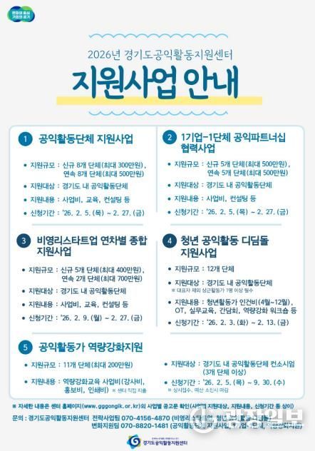 광장일보 주재영 기자 | 경기도공익활동지원센터가 ‘2026년 경기도 공익활동 지원사업’에 참여할 도내 공익활동 단체를 모집한다.