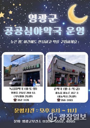 광장일보 주재영 기자 | 영광군은 오는 2월 9일부터 공공심야약국 2개소를 지정하여 매일 오후 8시부터 11시까지 운영한다고 밝혔다.
