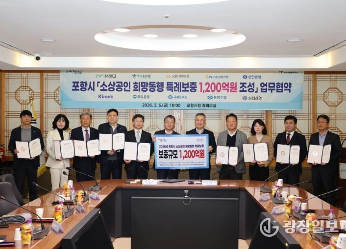 광장일보 주재영 기자 | 포항시는 자금 조달에 어려움을 겪는 소상공인을 지원하기 위해 6일 경북신용보증재단 및 협약 금융기관과 총 1,200억 원 규모의 ‘희망동행 특례보증재원’ 조성을 위한 업무협약(MOU)을 체결했다.