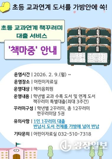 광장일보 주재영 기자 | 인천광역시교육청부평도서관은 9일부터 어린이자료실에서 초등교과 연계 책꾸러미 대출 서비스 ‘책마중’을 운영한다.