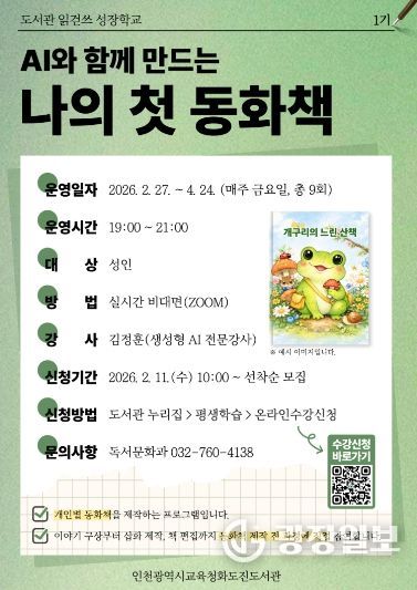 광장일보 주재영 기자 | 인천광역시교육청화도진도서관은 오는 27일부터 성인 대상 2026년 읽걷쓰 성장학교 1기 ‘AI와 함께 만드는 나의 첫 동화책’ 프로그램을 운영한다.