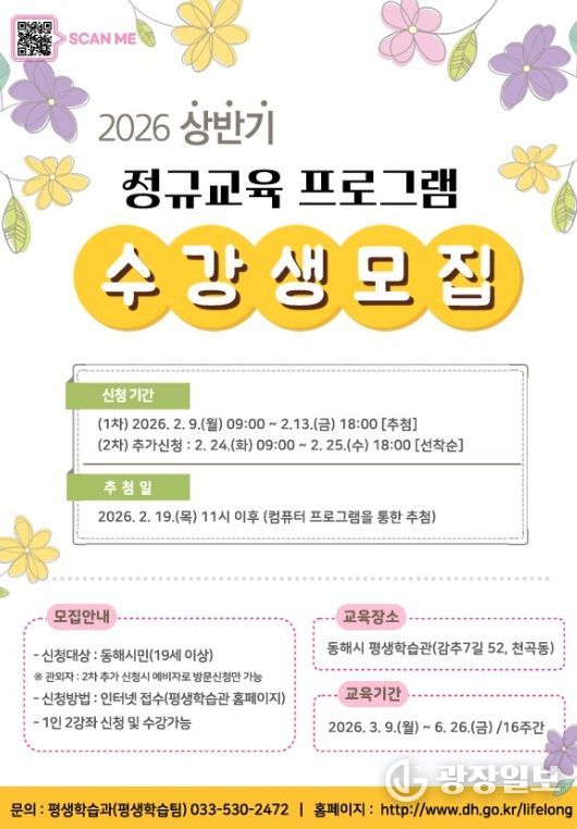 광장일보 이현나 기자 | 동해시는 지속 가능한 평생학습 환경 조성을 통해 시민의 삶의 질 을 높이기 위해, 동해시민을 대상으로‘2026년 동해시 평생학습관 상반기 정규교육’수강생을 모집한다고 밝혔다.