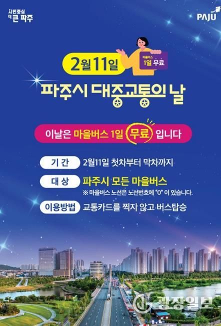광장일보 주재영 기자 | 파주시는 ‘대중교통의 날’을 맞아 대중교통 이용 활성화와 시민 교통비 부담 완화를 위해 오는 2월 11일 하루 동안 파주시 전 지역의 모든 마을버스를 무료로 운행한다.