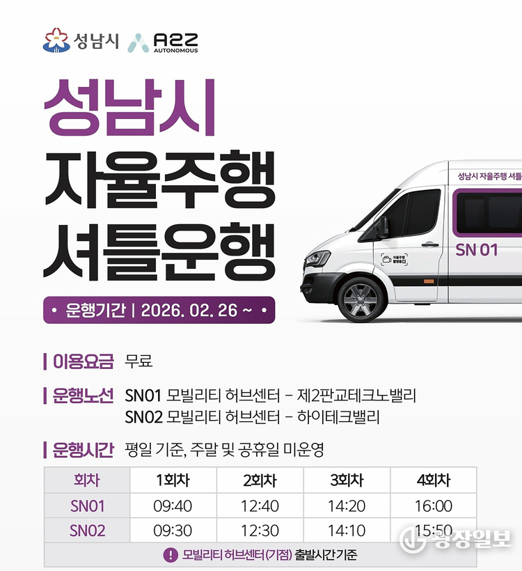 셔틀은 오는 2월 26일부터 2년간 시범 운영되며, 평일 오전 10시부터 오후 5시까지 하루 4회 운행한다. 시민 누구나 무료로 이용할 수 있고, 차량 1대당 최대 14명까지 탑승 가능하다. 안전관리자가 동승해 운행 안전을 관리한다.