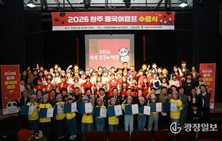 이번 수료식은 초등학교 2학년부터 중학교 1학년까지 학생 43명이 참여한 중국어캠프의 교육 성과를 공유하는 자리로, 유희태 완주군수와 유의식 군의회 의장, 재단 이사, 학부모 등 100여 명이 참석해 학생들의 성장을 함께 축하했다.