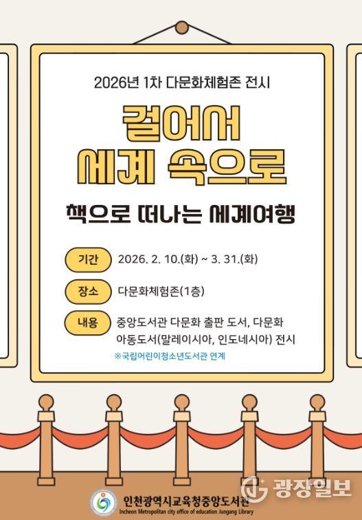 광장일보 주재영 기자 | 인천광역시교육청중앙도서관은 2월 10일부터 3월 31일까지 1층 다문화체험존에서 ‘책으로 떠나는 세계여행’ 전시를 개최한다.