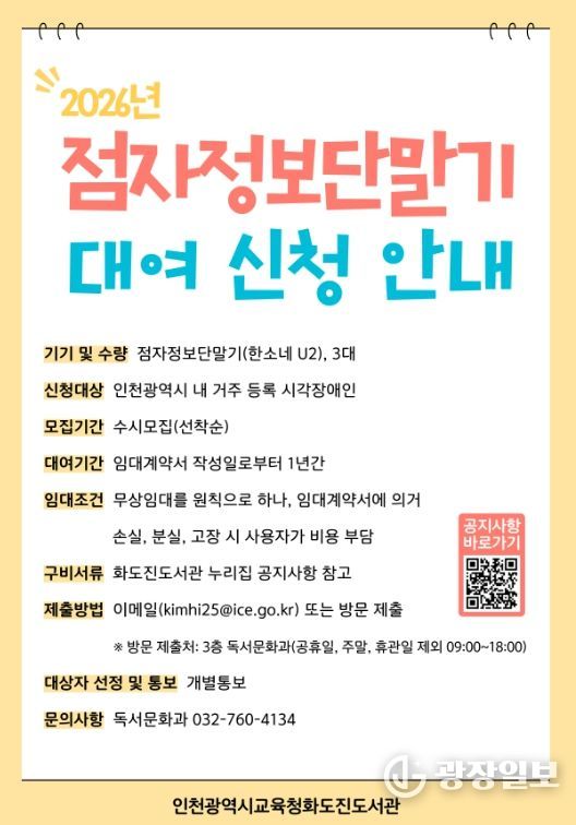 광장일보 주재영 기자 | 인천광역시교육청화도진도서관은 인천 거주 시각장애인을 대상으로 ‘점자정보단말기 무상대여 사업’을 운영한다고 9일 밝혔다.