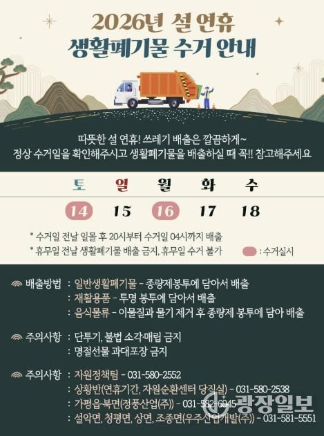 광장일보 주재영 기자 | 가평군은 설 명절을 맞아 군민과 방문객 모두가 쾌적한 환경에서 청결한 연휴를 보낼 수 있도록 생활폐기물 처리 대책을 마련했다.