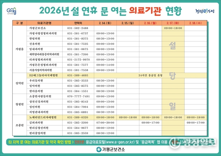 이와 함께 가평군은 설 연휴 동안 운영하는 의료기관과 약국 정보를 사전에 안내하고 있다. 연휴 기간 문을 여는 의료기관 및 약국 정보는 가평군청 및 가평군보건소 홈페이지를 비롯해 119구급상황관리센터, 응급의료포털, 보건복지콜센터(129)를 통해 확인할 수 있다.