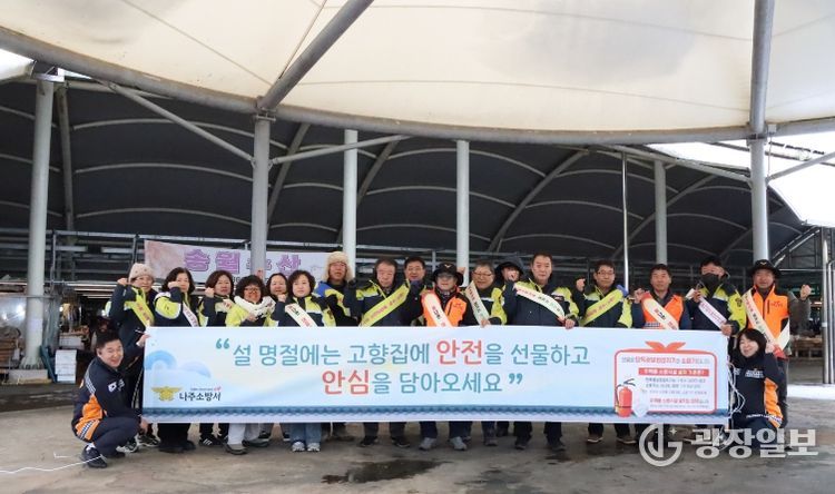 광장일보 주재영 기자 | 나주소방서(서장 신향식) 설 명절을 앞두고 화재 예방과 초기 대응 능력 강화를 위해 의용소방대와 영산포 풍물시장을 찾아 ‘주택용 소방시설 설치하기’ 홍보 캠페인을 전개했다.